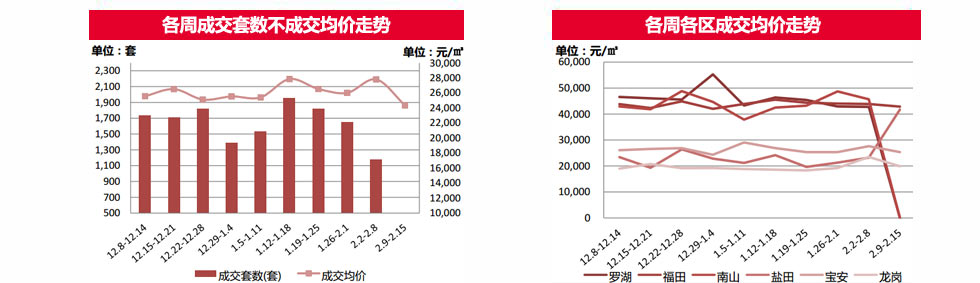 由于春節假期將至,并且本周(2.9-2.15)無新盤入市,深圳一手住宅成交套數及成交面積下跌均接近八成;成交均價下跌超一成。