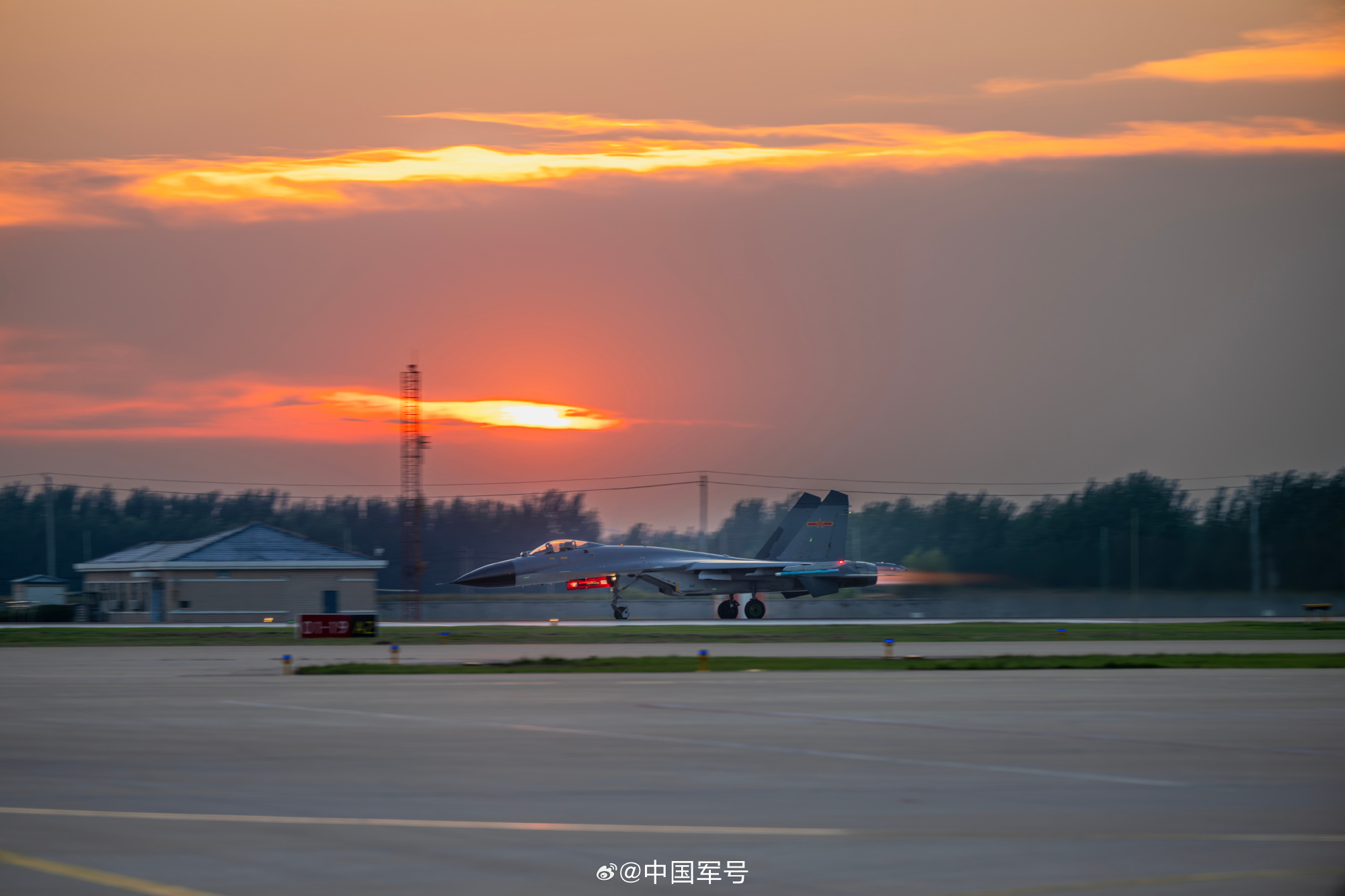 战机在夕阳下拖着尾焰呼啸升空