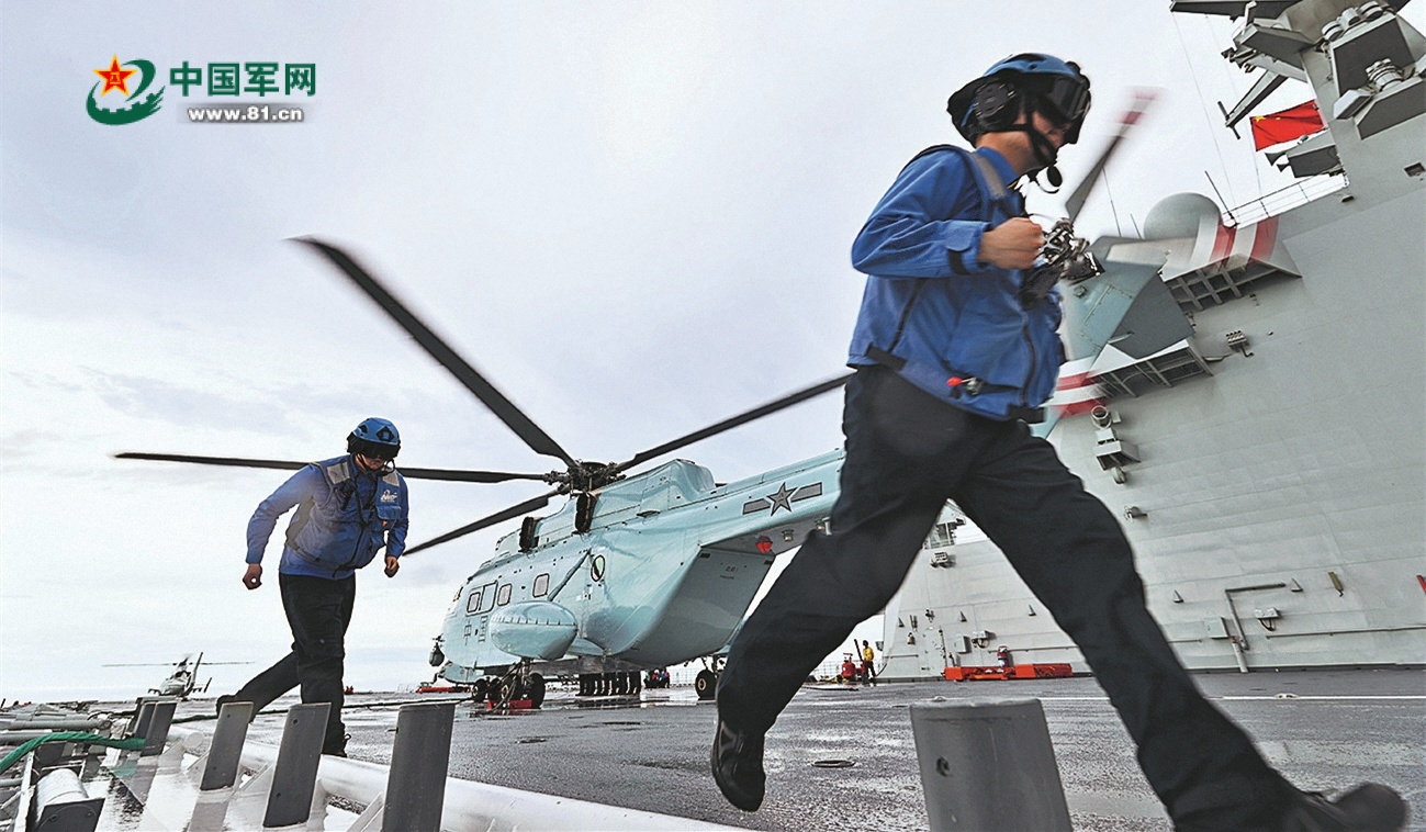 “舰载直升机起降部署!”接到命令,舰载直升机转运小组快速将舰载直升机转运至甲板。铁翼飞旋,数架直升机腾空而起,新一轮训练在海天之间展开。