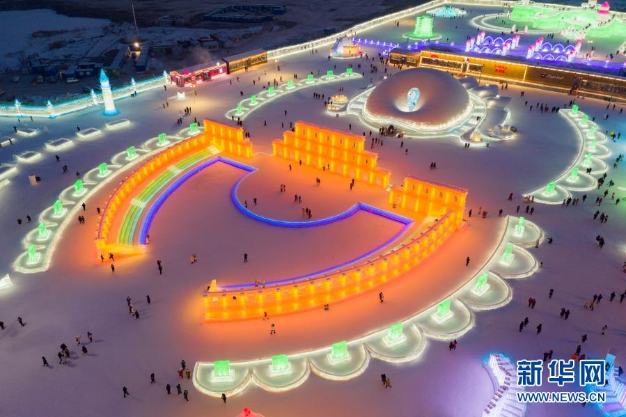 這是2021年1月1日拍攝的哈爾濱冰雪大世界園區一角(無人機照片)。