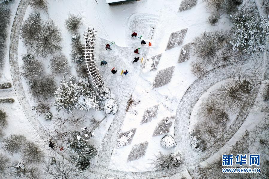 1月28日,在沈陽市渾南區,一小區物業的工作人員在清掃積雪(無人機照片)。