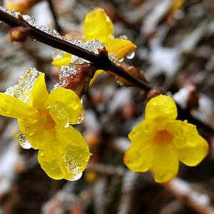 3月1日在北京中國(guó)人民革命軍事博物館附近拍攝的被冰雪覆蓋的迎春花。