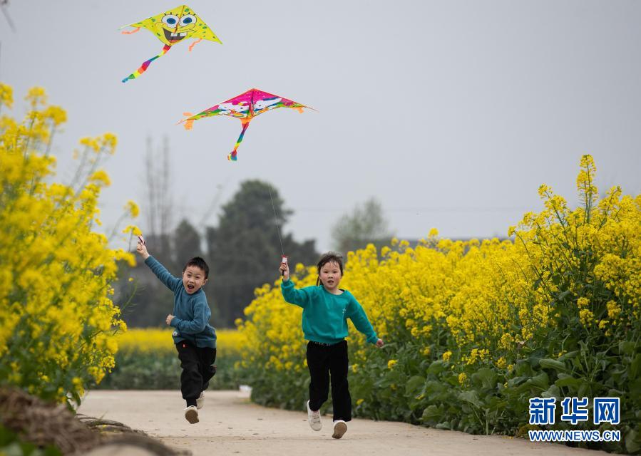 3月14日,小朋友在安州區秀水鎮龍泉村放風箏。新華社記者 江宏景 攝