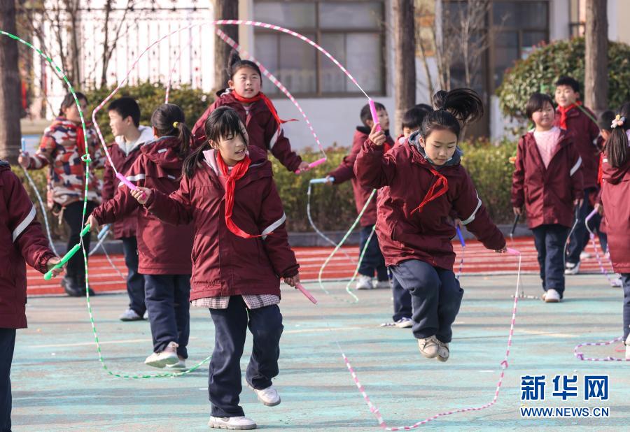 騎路小學的學生們在參加早操跳繩鍛煉(3月10日攝)。新華社記者 楊磊 攝