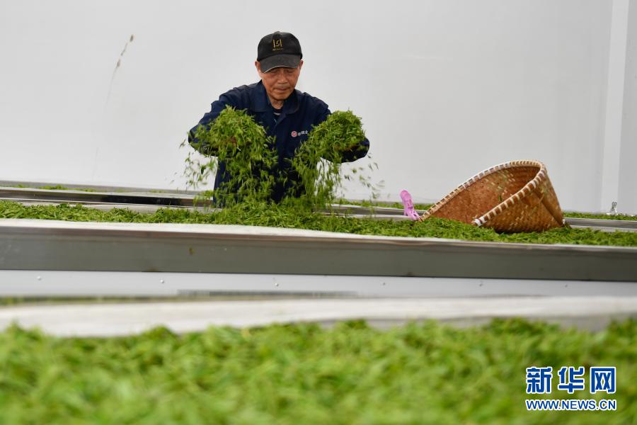 3月20日,余杭區(qū)余杭街道竹園村一家茶場的工人在對新采的茶葉攤青。
