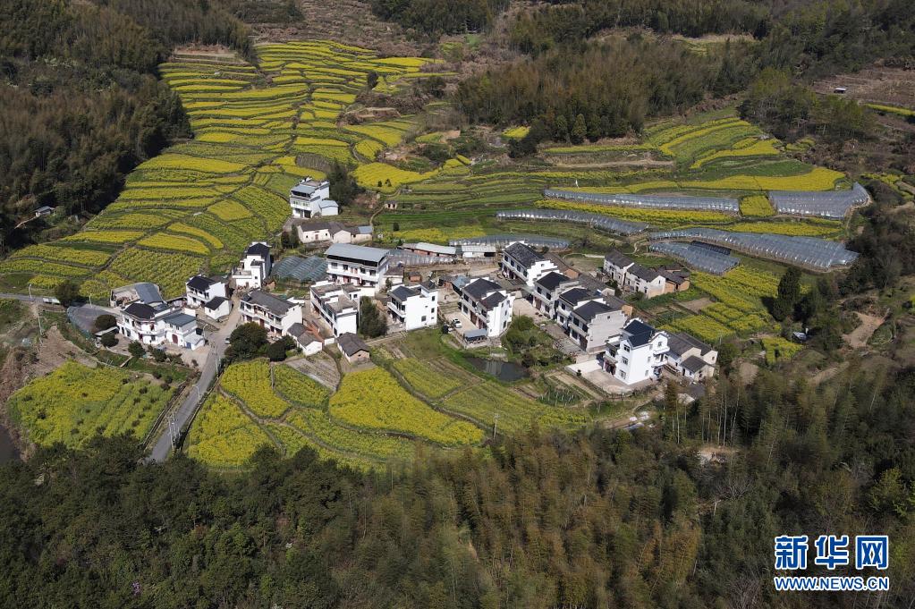 這是3月26日拍攝的花海中的黃山市徽州區(qū)靈山村(無人機照片)。