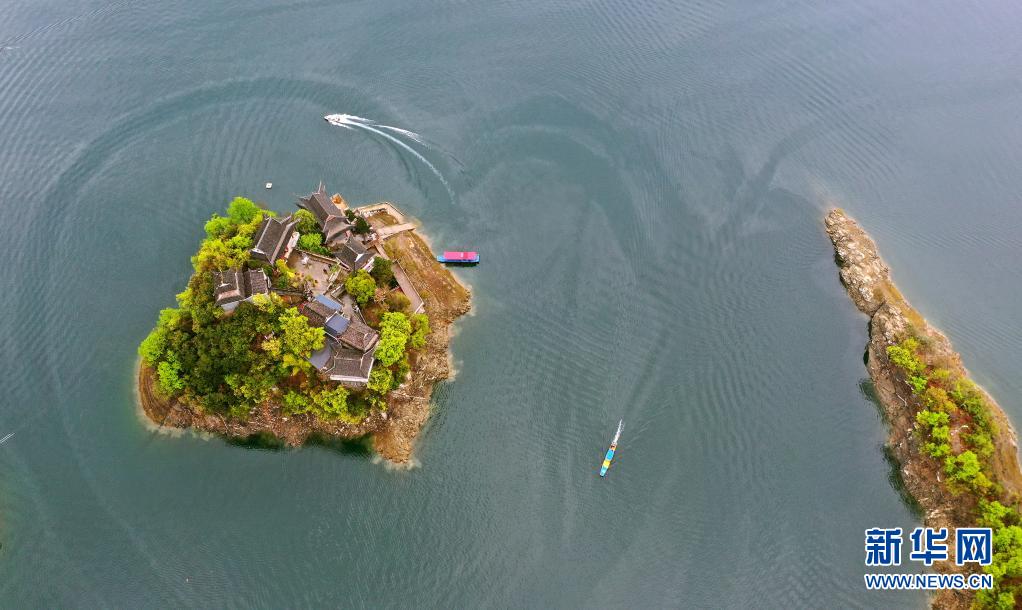 游人乘船在流水鎮的漢江上游玩(3月26日攝,無人機照片)。