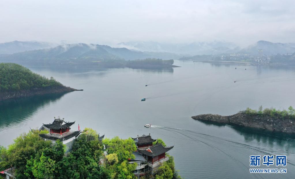 游人乘船在流水鎮的漢江上游玩(3月26日攝,無人機照片)。