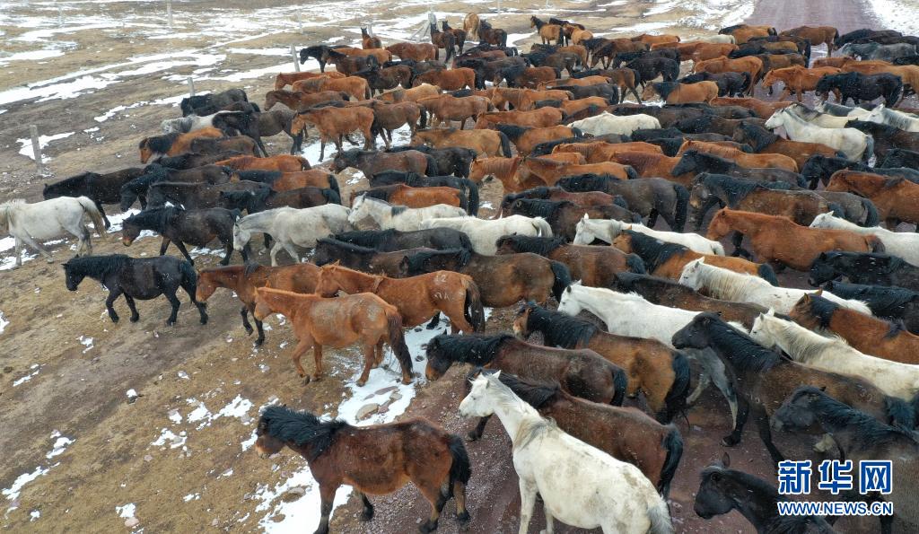 3月31日在山丹馬場拍攝的風雪中的馬群(無人機照片)。