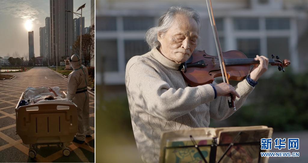 這是一張拼版照片,左圖為:2020年3月5日傍晚,在湖北省武漢大學(xué)人民醫(yī)院東院,復(fù)旦大學(xué)附屬中山醫(yī)院支援湖北醫(yī)療隊(duì)醫(yī)生在護(hù)送患者王欣做CT的途中停下,讓住院近一個(gè)月的老人欣賞久違的日落(甘俊超 攝);右圖為:3月24日,“看夕陽的老人”王欣在東西湖區(qū)園藝花城小區(qū)內(nèi)拉小提琴(新華社記者熊琦攝)。新華社發(fā)