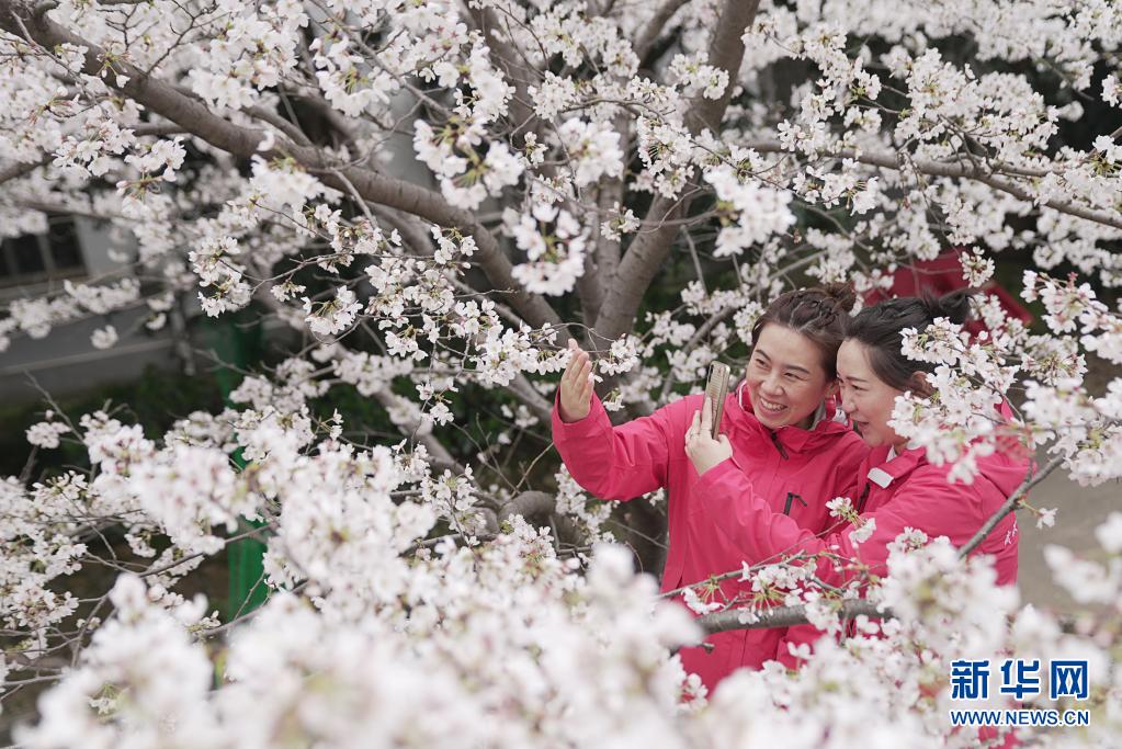 3月13日,武漢雷神山醫(yī)院醫(yī)護人員在櫻花樹下賞花。當(dāng)日,武漢大學(xué)抗疫醫(yī)護人員賞櫻專場啟動,來自全國各地的援鄂抗疫英雄在櫻花樹下重逢,盡享櫻花之約。新華社記者 熊琦 攝