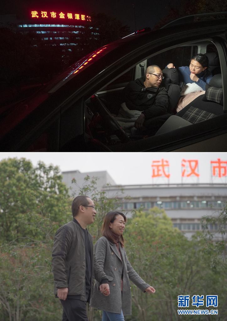 這是一張拼版照片,上圖為:2020年2月22日晚,武漢市金銀潭醫院的醫護夫妻涂盛錦(左)與曹珊在車內聊天。從大年初一開始,兩人就住進車里,為在疫情中搶救病患,爭分奪秒,以車為家;下圖為:3月23日,武漢市金銀潭醫院的醫護夫妻涂盛錦和曹珊在下班路上。新華社記者 熊琦 攝