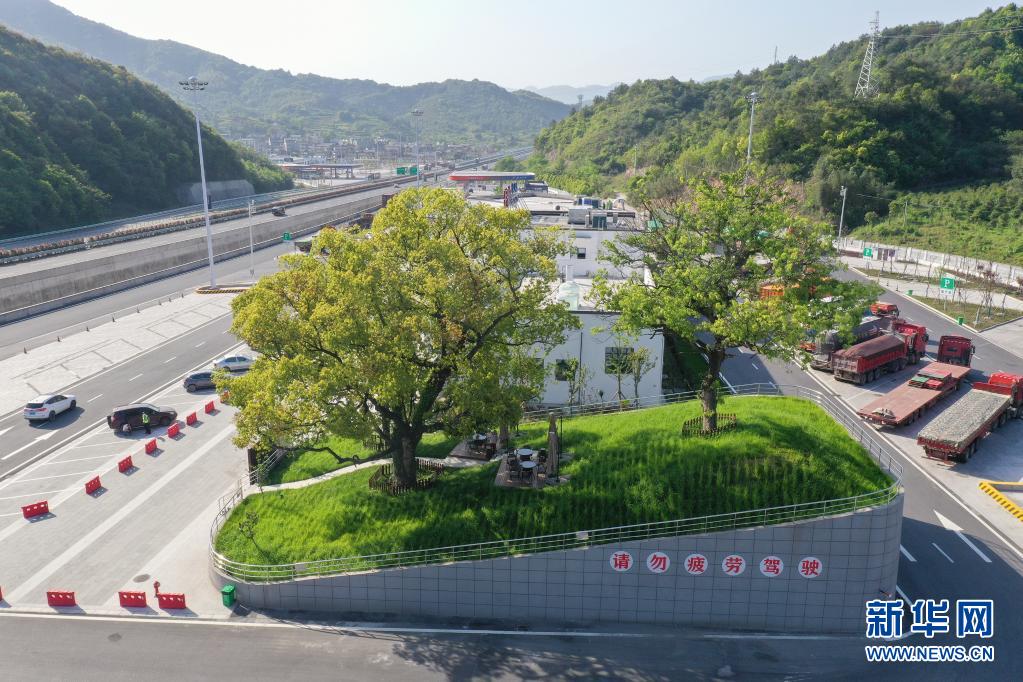 杭州第二繞城高速西復線次塢服務區(qū)有3棵樹齡在100年以上的古樹。服務區(qū)在建設(shè)過程中,將古樹保護起來,現(xiàn)已成為一道特色景觀。新華社發(fā)(郭斌 攝)