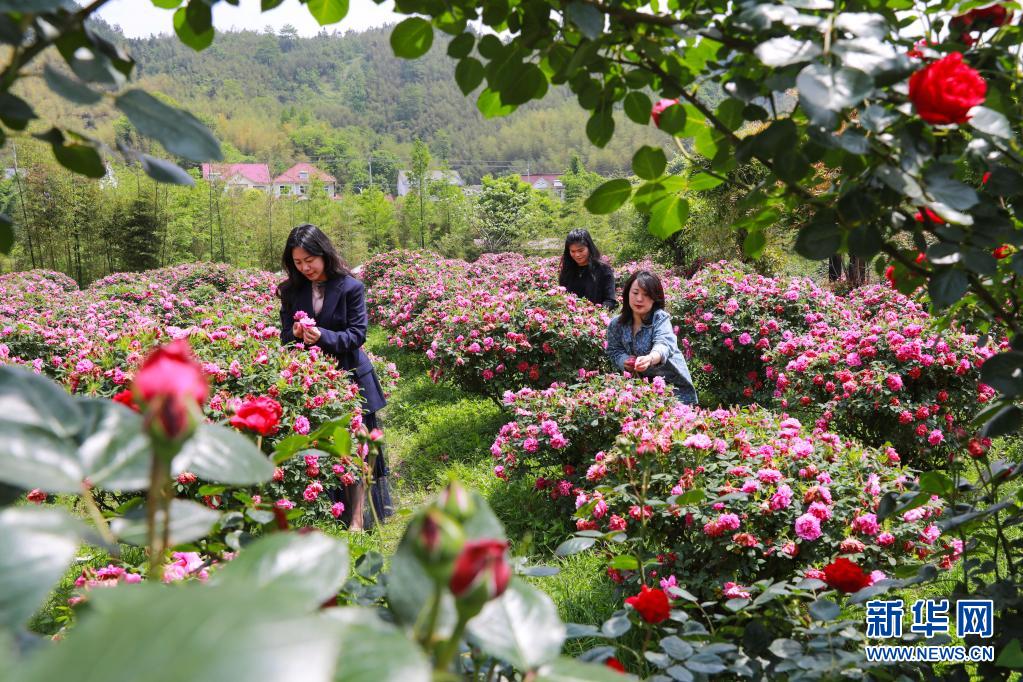 4月26日,游客在位于杭州市臨安區天目山鎮天目月鄉的示范型村落景區玫瑰園內采摘食用玫瑰花。近日,各地鮮花盛開,吸引人們走出家門踏青賞花。新華社發(胡劍歡 攝)