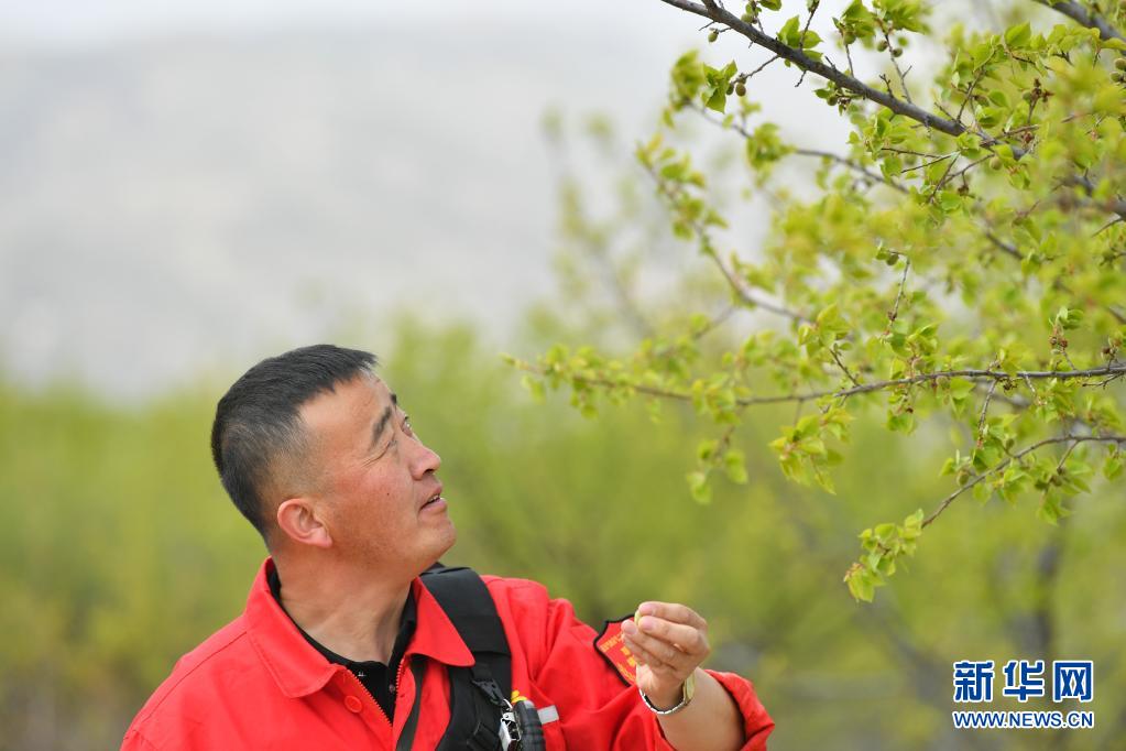 4月27日,巡線隊(duì)員張浩軍在巡線途中采摘野生水果補(bǔ)充體能。新華社記者 張博文 攝