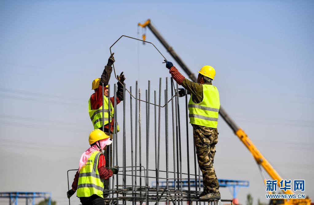 5月1日,寧夏銀川市經(jīng)濟(jì)技術(shù)開發(fā)區(qū)中環(huán)50GW(G12)太陽能級(jí)單晶硅材料智慧工廠項(xiàng)目的工人在現(xiàn)場作業(yè)。
