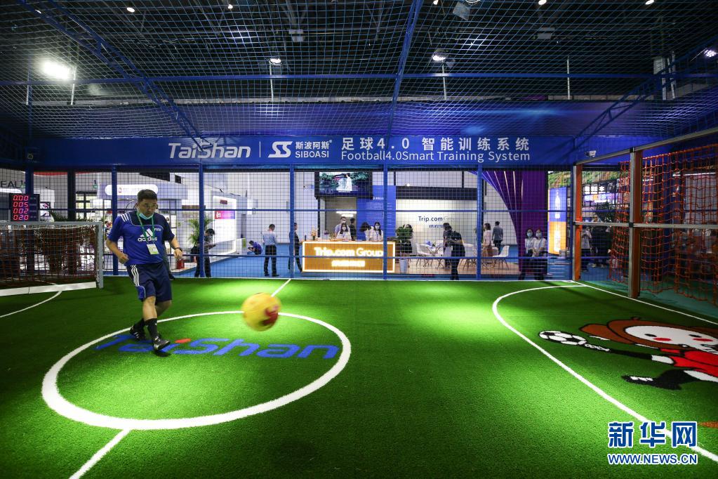 5月7日,參展商在消博會(huì)現(xiàn)場演示足球智能訓(xùn)練系統(tǒng)。