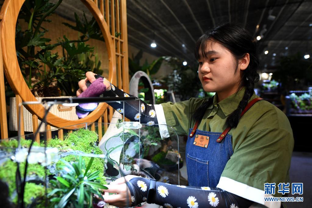 5月7日,在秦嶺花世界現(xiàn)代農(nóng)業(yè)園區(qū),花藝師韓佳馨在對盆景進(jìn)行清潔養(yǎng)護(hù)。
