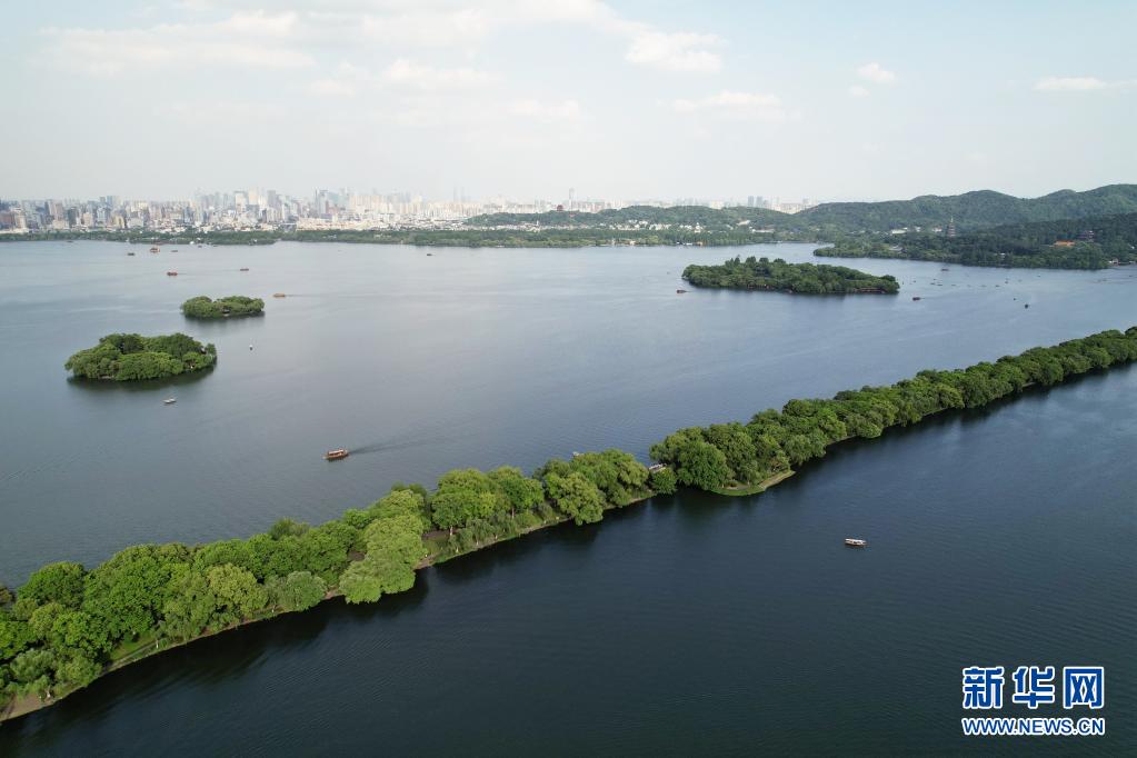 這是5月7日拍攝的杭州西湖景色(無人機(jī)照片)。