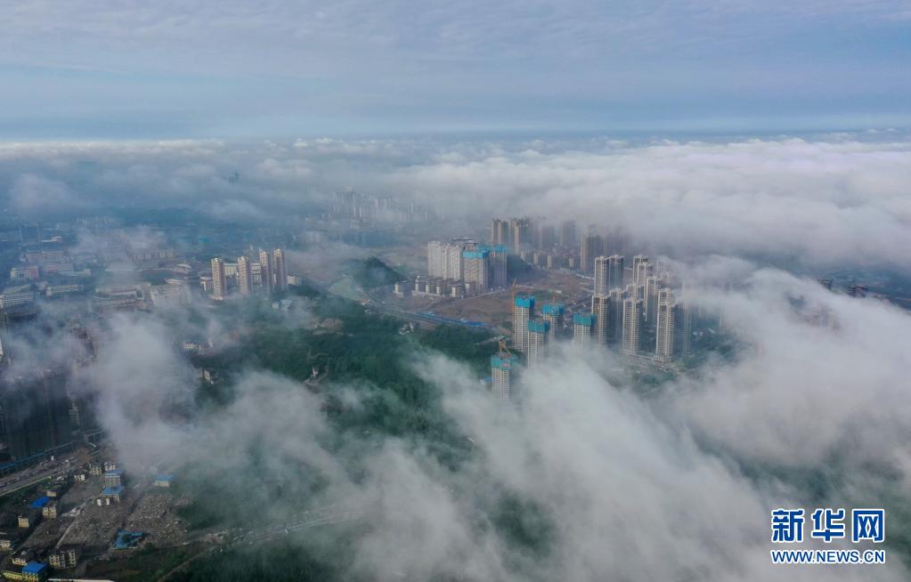 5月8日,貴陽市觀山湖區的高樓被霧氣籠罩(無人機照片)。