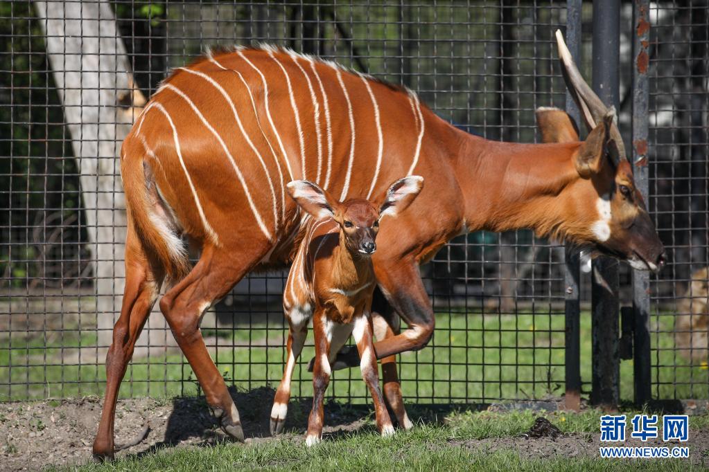 5月10日,兩周大的幼年山地紫羚與母親一起在波蘭首都華沙的華沙動(dòng)物園的籠舍中散步。