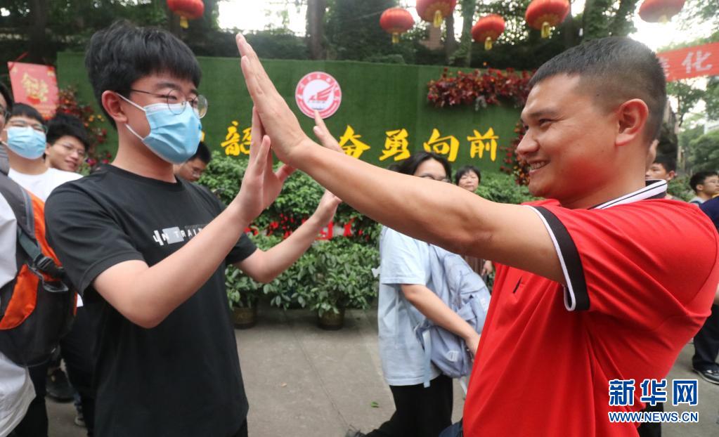 6月9日,在湖南省婁底市第二中學(xué)考點(diǎn),走出考場(chǎng)的老大李慶國和班主任宋老師擊掌。