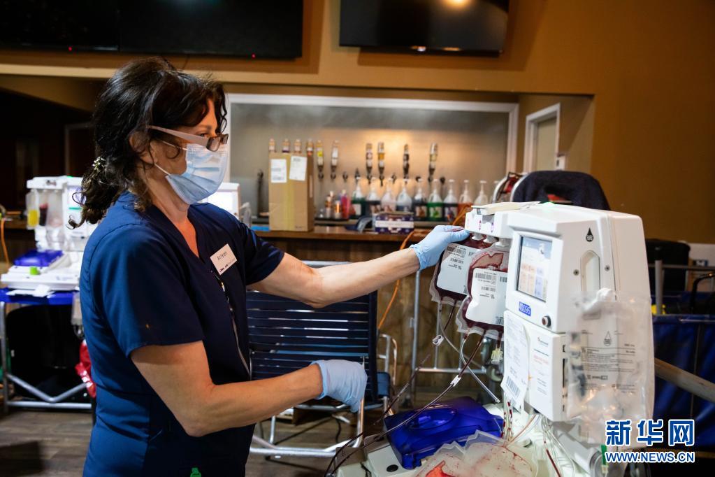 6月14日,在美國紐約州長島地區的貝肖爾,工作人員在美國紐約血液中心舉行的獻血活動上處理采集的血液。