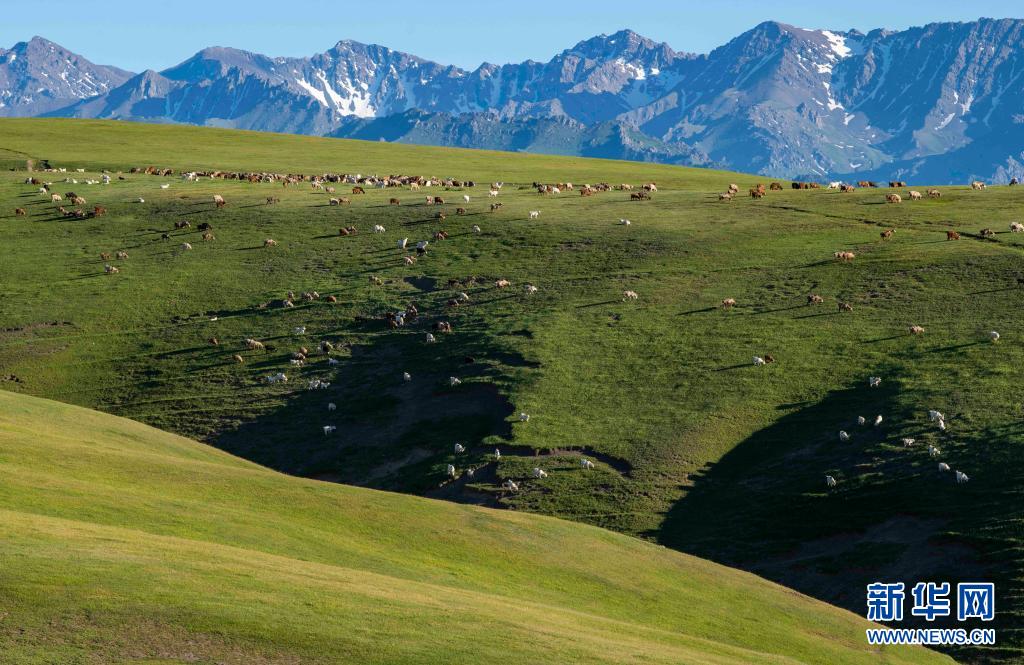 新疆裕民縣巴爾魯克山區(qū)夏牧場(chǎng)上的羊群(6月14日攝)。