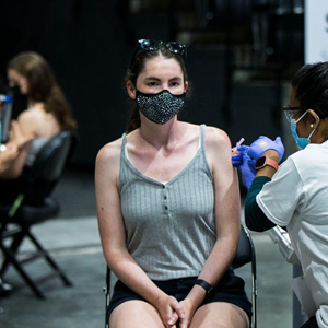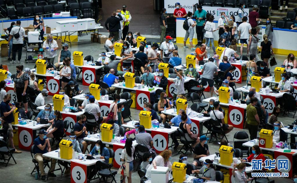 6月27日,在加拿大多倫多,人們在大型新冠疫苗接種中心接種疫苗。