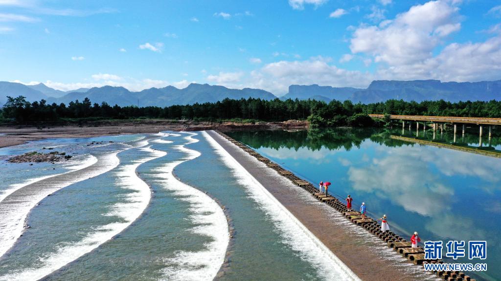 7月6日,市民在浙江省臺州市仙居縣永安溪白塔鎮段游玩(無人機照片)。
