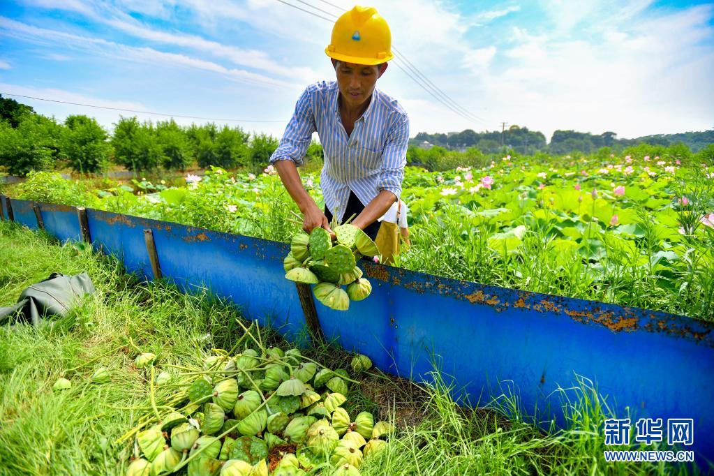 7月11日,在湖南省湘潭市雨湖區姜畬鎮聯映村,蓮農收集采摘好的蓮蓬。新華社記者 陳澤國 攝
