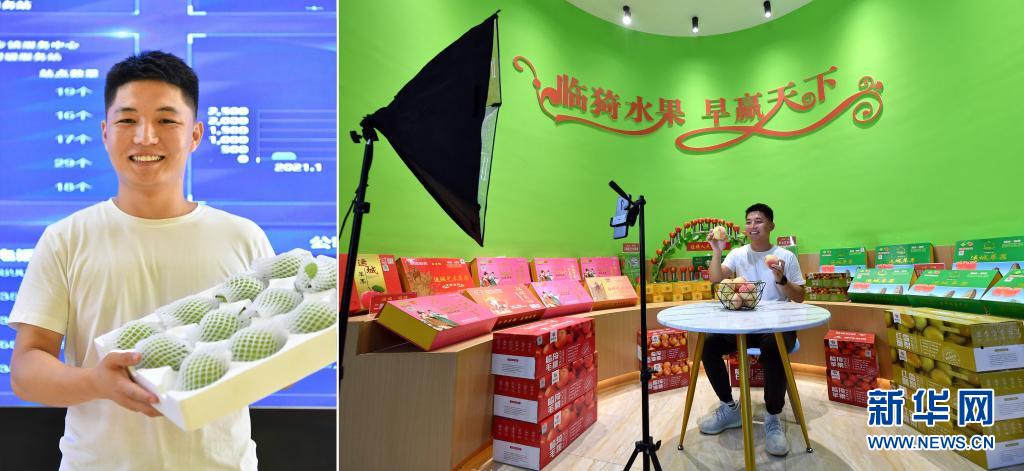 拼版照片:左圖為董晨旭展示山西省臨猗縣產的梨;右圖為董晨旭通過網絡直播介紹當地產的桃(7月13日攝)。今年22歲的董晨旭是臨猗縣北景鄉張村人,他年紀不大,卻有著豐富的開店經驗。為了幫助鄉親們在網上銷售水果,他于2020年3月開始在電商平臺創業,店鋪在旺季達到一天一萬余箱的銷售量,讓他對農村電商發展充滿了信心。