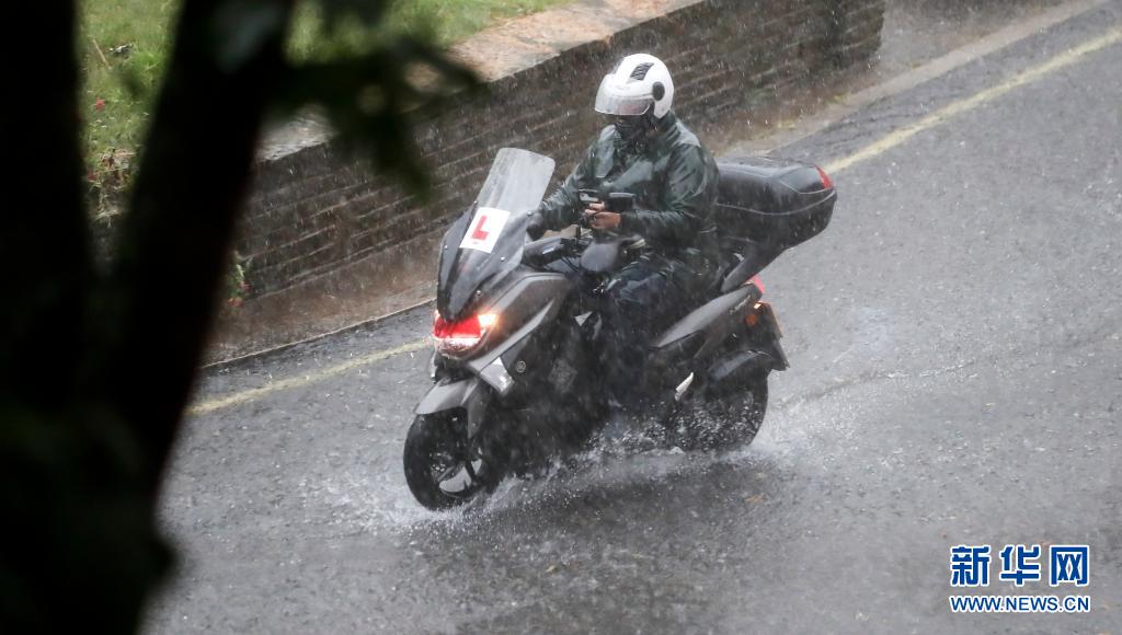 7月25日,一名男子騎著摩托車(chē)在英國(guó)倫敦的大雨中行駛。