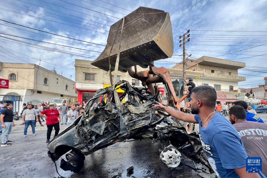 11月3日,在黎巴嫩南部奈拜提耶省杜韦尔镇,人们在以色列空袭现场清理车辆残骸。新华社发(阿里·哈希绍摄)