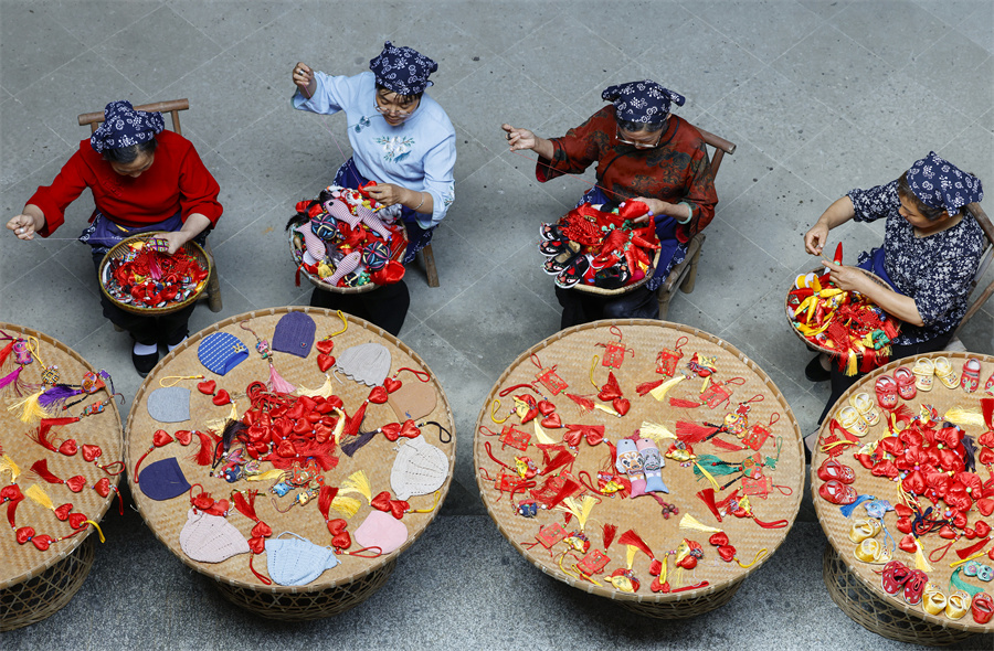 临近端午佳节,在安徽省黄山市歙县许村镇许村,村民用五彩丝线、棉绸布、草药香料等材料,巧妙地缝制出造型各异、缤纷多彩的非遗“徽州端午锦”,蕴含平安健康的美好祝愿,深受人们的喜爱。