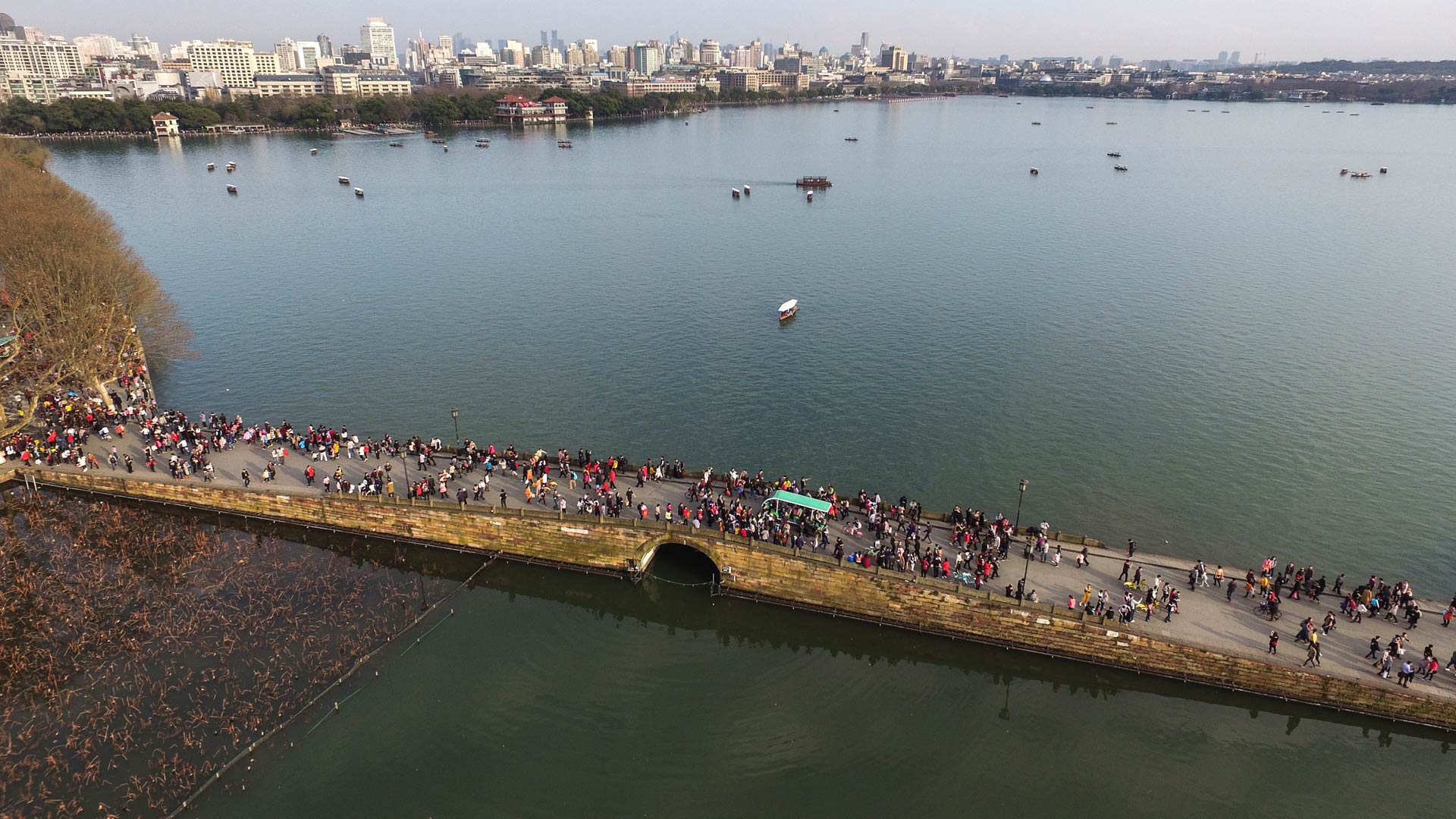 這是2月11日航拍的西湖景區斷橋。新華社記者 黃宗治 攝