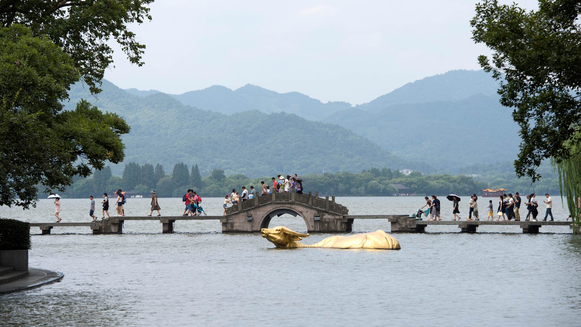 雷峰塔和西湖長橋(8月29日攝)。 西湖自然和歷史原貌逐步恢復。2002年起,杭州實行“西湖免費開放”,西湖環湖公園全線打通后,不設圍墻、不收門票,西湖美景成為人人能享受的公共產品。(新華社記者 張鋮 攝)