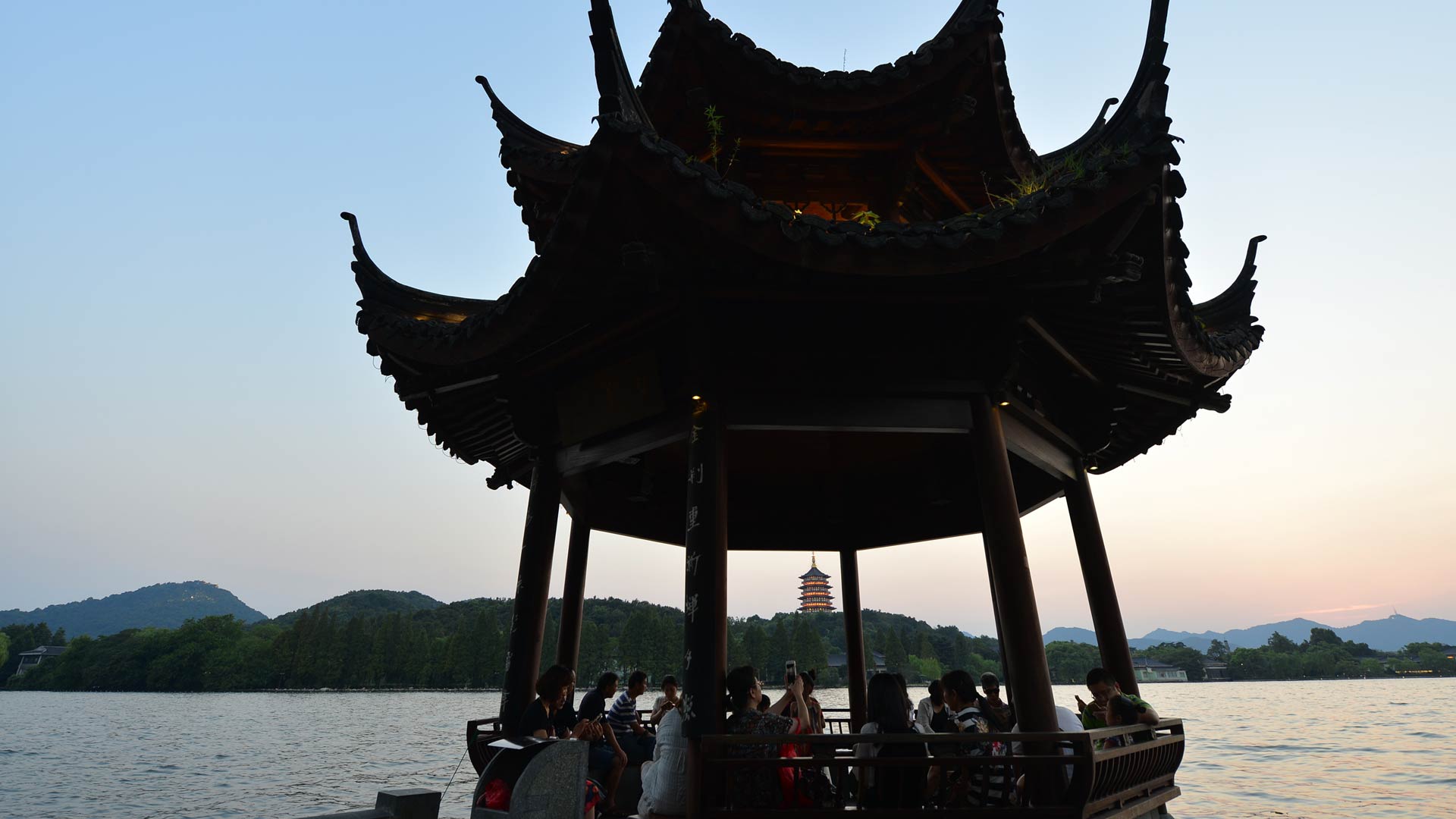 游客乘坐游船在西湖上游覽(8月27日攝)。 “三面云山一面城”,西湖的美麗自古就為眾多的作家和藝術家所稱頌。“西湖十景”被認為是“天人合一”最理想最經典的景觀體現。(新華社記者 陳曄華 攝)