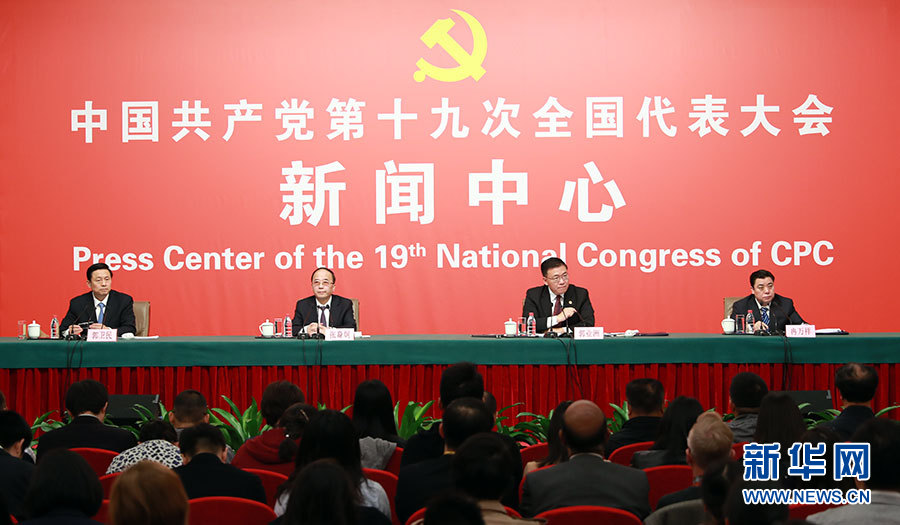 10月21日,十九大新聞中心舉辦記者招待會,邀請中共中央統戰部常務副部長張裔炯、副部長冉萬祥,中共中央對外聯絡部副部長郭業洲介紹黨的統一戰線工作和黨的對外交往情況,并回答記者提問。圖為記者招待會現場。新華網 郝廣鵬攝
