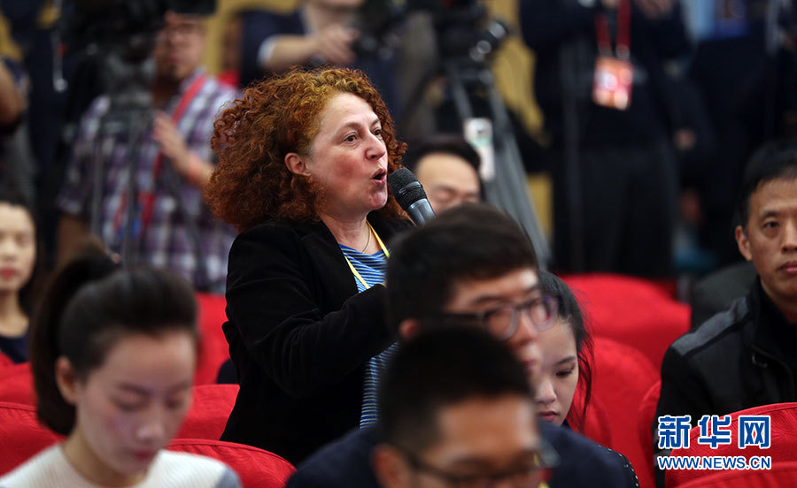 10月22日,十九大新聞中心在梅地亞中心二層新聞發布廳舉辦集體采訪活動,主題為“中國特色強軍之路邁出堅定步伐”。圖為意大利24小時太陽報記者提問。新華網 郝廣鵬攝