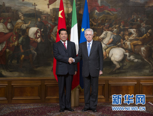 ????當(dāng)?shù)貢r(shí)間11月28日,全國政協(xié)主席賈慶林在羅馬會見意大利總理蒙蒂。(來源:新華社記者 李學(xué)仁 攝)
