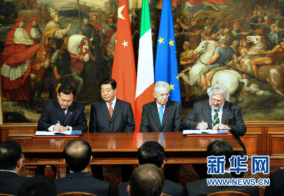 ????當地時間11月28日,中國全國政協主席賈慶林在羅馬和意大利總理蒙蒂共同出席中意兩國電信、新能源汽車等領域合作項目協議的簽字儀式。(來源:新華社記者 李學仁 攝)