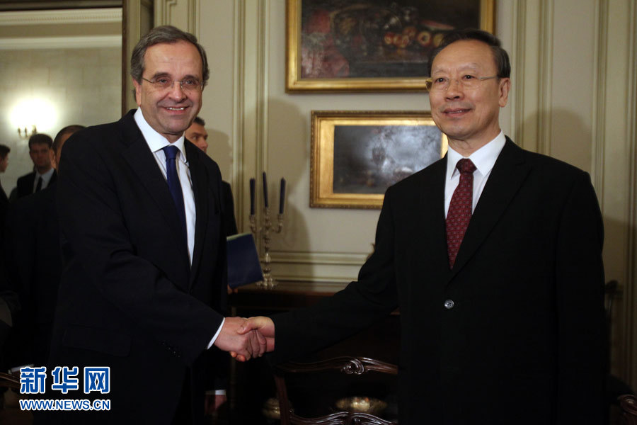 ??? 11月18日,希臘總理薩馬拉斯(左)在首都雅典會(huì)見到訪的中共中央書記處書記、全國政協(xié)副主席杜青林。 新華社發(fā)(馬里奧斯·羅洛斯攝)