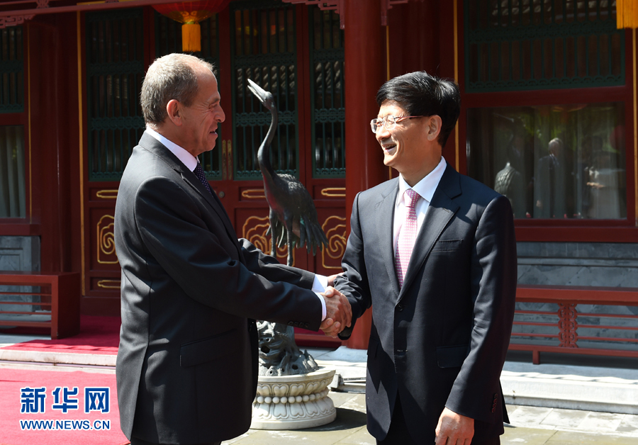 ??? 9月7日,中共中央政治局委員、中央政法委書記孟建柱在釣魚臺國賓館會見由主席佩里率領的英國48家集團俱樂部代表團。 新華社記者張領攝