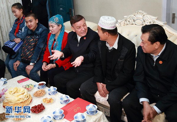 ????9月28日,全國人大常委會副委員長、中央代表團(tuán)副團(tuán)長艾力更·依明巴海率中央代表團(tuán)三分團(tuán)在昌吉回族自治州、烏魯木齊市看望慰問當(dāng)?shù)馗髯甯刹咳罕姟_@是艾力更·依明巴海在昌吉市榆樹溝鎮(zhèn)閔昌回民新村看望回族村民丁虎一家。新華社記者丁海濤攝