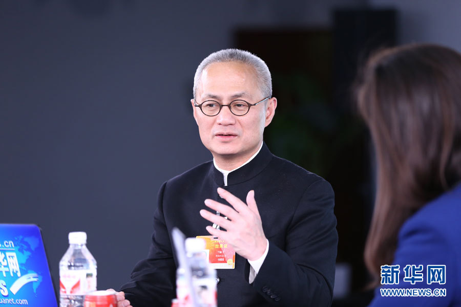 ??? 2015年3月14日,全國人大代表、鳳凰古城文化旅游投資股份有限公司董事長葉文智做客新華會客廳。圖為葉文智與主持人交談。新華網 李江 攝