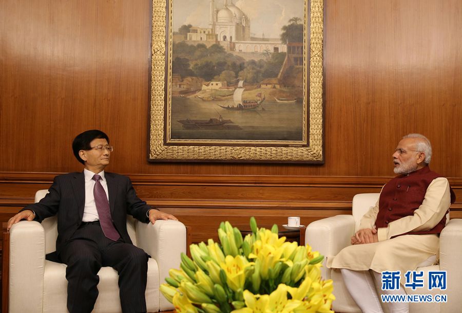 ????11月9日,印度總理莫迪(右)在新德里會(huì)見(jiàn)到訪的習(xí)近平主席特使、中共中央政治局委員、中央政法委書記孟建柱。 新華社記者李明攝