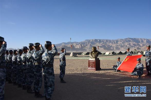 黃繼光生前所在連官兵赴高原參加實戰化訓練,連指導員余海龍帶領官兵莊嚴宣誓(2016年6月17日攝)。新華社發(袁文濤 攝)