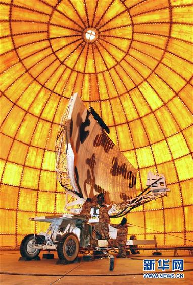 駐守藏北某雷達站擔負節日值班工作的官兵,精心檢查維護雷達天線,確?!扒Ю镅邸泵髁粒?011年1月30日攝)。新華社發(劉應華 攝)