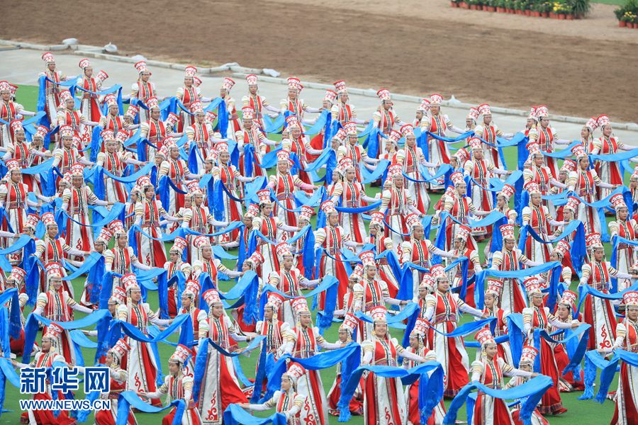 8月8日,內蒙古自治區成立70周年慶祝大會在呼和塔拉內蒙古少數民族群眾文化體育運動中心舉行。圖為群眾行進表演。新華網記者 陳杰 攝